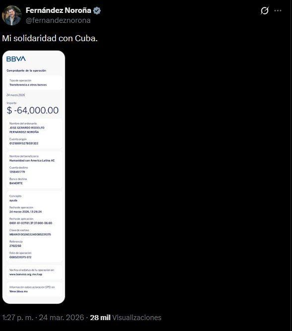 A través de sus redes sociales, Fernández Noroña compartió una captura de pantalla que mostraba el comprobante de la transacción, realizada el martes 24 de marzo a las 13:26 horas. La imagen fue acompañada por la declaración “Mi solidaridad con Cuba”, confirmando su apoyo a la isla.